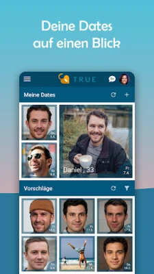 Mit True wollen wir dir eine vollkommen neue Art des Kennenlernens und Datens zeigen: Die App sorgt dafür, dass sich Paare, bei denen sich beide gegenseitig gefallen, sofort im realen Leben kennenlernen, anstatt unzählige oberflächliche Nachrichten auszutauschen.