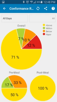  Conformance Report - This report displays pre- and post- meal glucose results in a pie chart format. Each pie chart is divided into color coded sections identifying the percentage of glucose results that are above, within or below targeted ranges for each testing time.